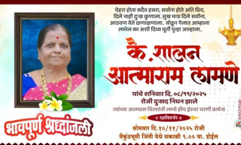 कराड:- जिंती तालुका कराड येथील प्रवीण लामणे यांच्या मातोश्री कै.शालन आत्माराम लामणे यांचे अल्पशा आजाराने निधन झाले. तसेच संजय तुकाराम लामणे यांच्या त्या काकी आहेत.जिंती गावची सून म्हणून त्यांनी आत्माराम लामणे यांना वैवाहिक जीवनात सुखदुःखात साथ दिली. मुलांचे संगोपन करून त्यांनी मुलांना चांगले शिक्षण दिले. त्यांच्या कुटुंबात पाठीमागे पती, मुलगा प्रवीण , सून, मुलगी सुनीता आणि नातवंड असा परिवार आहे. रक्षा विसर्जन कार्यक्रम सोमवार दिनांक १०-११-२०२५ रोजी सकाळी ९.०० वाजता जिंती वैकुंठ भूमी येथे होणार आहे.