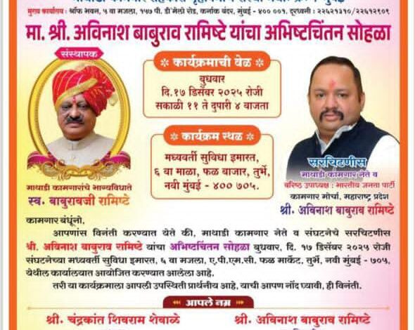 नवी मुंबई:- ग्रामीण भागातील सामान्य कुटुंबातून मुंबई स्थित ठिकाणी कामगारांच्या हितासाठी आयुष्य वेचले व अन्यायाविरुद्ध आवाज उठवणाऱ्या माथाडीचे कैवारी अविनाश बाबुराव रामिस्टे (माथाडी कामगार नेते व वरिष्ठ उपाध्यक्ष भारतीय जनता पार्टी) यांचा वाढदिवस अभिष्टचिंतन सोहळा बुधवार दिनांक १७ डिसेंबर २०२५ रोजी सकाळी ११ ते दुपारी ४ वाजेपर्यंत संघटनेच्या मध्यवर्ती सुविधा इमारत ,सहावा मजला, एन. पी .एम .सी.फळ मार्केट ,तुर्भे ,नवी मुंबई येथे संपन्न होणार आहे. या कार्यक्रमासाठी अनेक दिग्गज नेते व सामाजिक कार्यकर्ते उपस्थित राहणार आहेत. त्याचबरोबर युनियनचे सर्व पदाधिकारी कार्यकर्ते मुकादम कामगार व कर्मचारी वर्ग उपस्थित राहणार आहे.