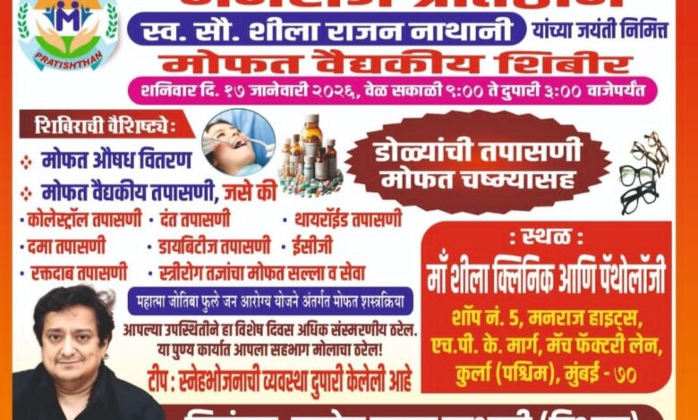 मुंबई:- शनिवार दिनांक १७ जानेवारी, केवळ एक वैद्यकीय शिबिर नव्हते, तर करुणा, माया आणि सेवाभावाने ओथंबलेली एक जिवंत श्रद्धांजली होती. स्वर्गीय श्रीमती शीला राजन नथानी यांच्या ७० व्या जयंतीनिमित्त मनराज प्रतिष्ठानच्या वतीने कुर्ला , मानिकपाडा येथे ४४० वे मोफत वैद्यकीय शिबिर आयोजित करण्यात आले. या शिबिरातून २ हजारांहून अधिक नागरिकांना थेट लाभ मिळाला.